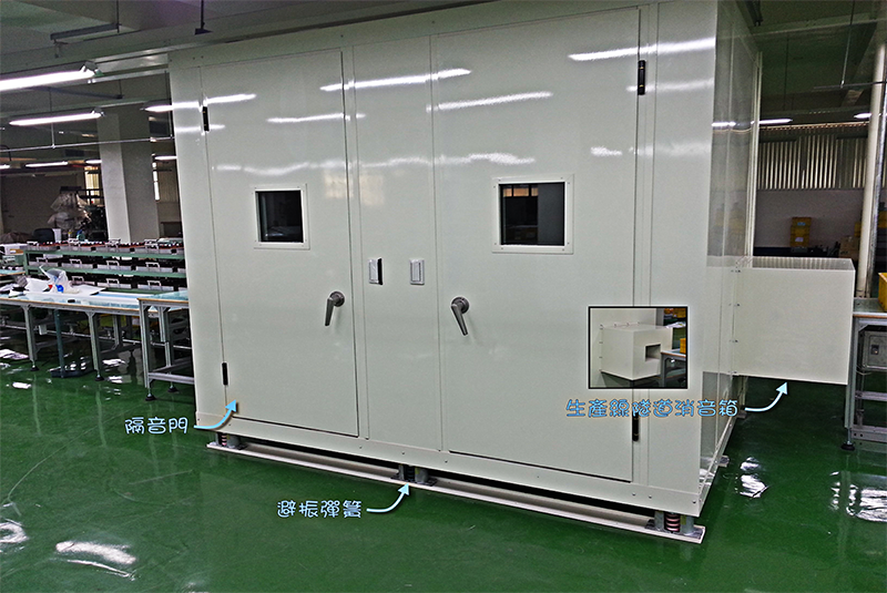 家用空调器、电冰箱、洗衣机、吸尘器、洗碗机、热水器等所用的薄壁零件,多数是用自动高速冲床冲压出来的,自动高速冲床通常是安装于零部件车间的大厂房内,其噪声高达105dB(A)左右,给操作者和周围环境带来严重的噪声污染。为降低自动高速冲床噪声带来的影响,一般都是在自动高速冲床的外侧加装大型隔音室。隔声室顶棚和四壁用钢结构复合隔声板拼装而成,上料部分开设自动上料口并做隔声处理,出料端安装气动自动开关装置或电动自动开关装置,无气或停电时可手动开关。出料装置与高速自动冲床互锁,隔声室顶部安装排风机,在排风机出口和隔声室进风口处安装消音器。隔声室四壁墙上安装双层玻璃隔声采光窗和钢结构密封隔声门,隔声室内可安装分体式空调、电源开关箱、照明等。